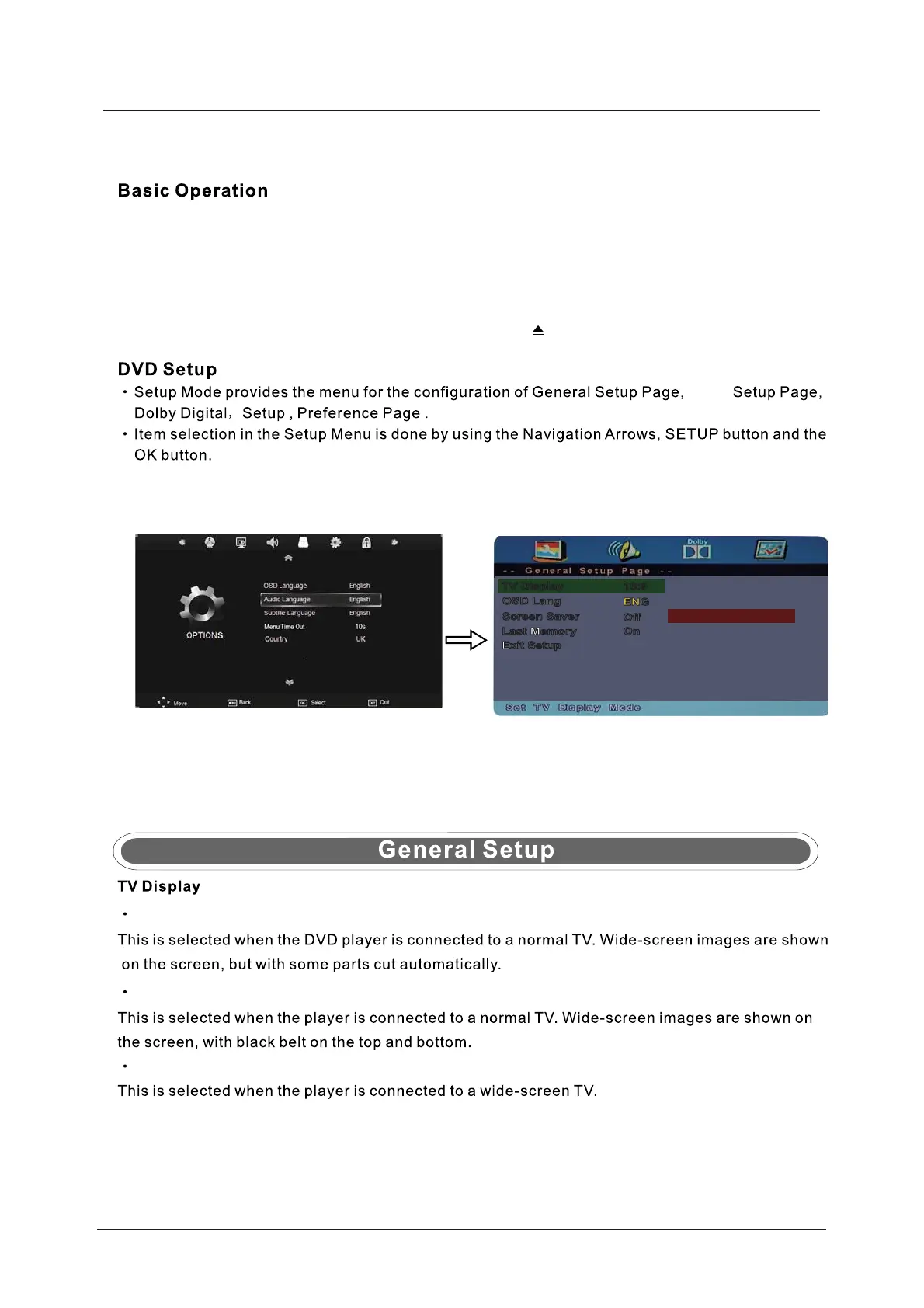 Press MENU button on the remote control and select OPTIONS menu as below, then select DVD SETUP,