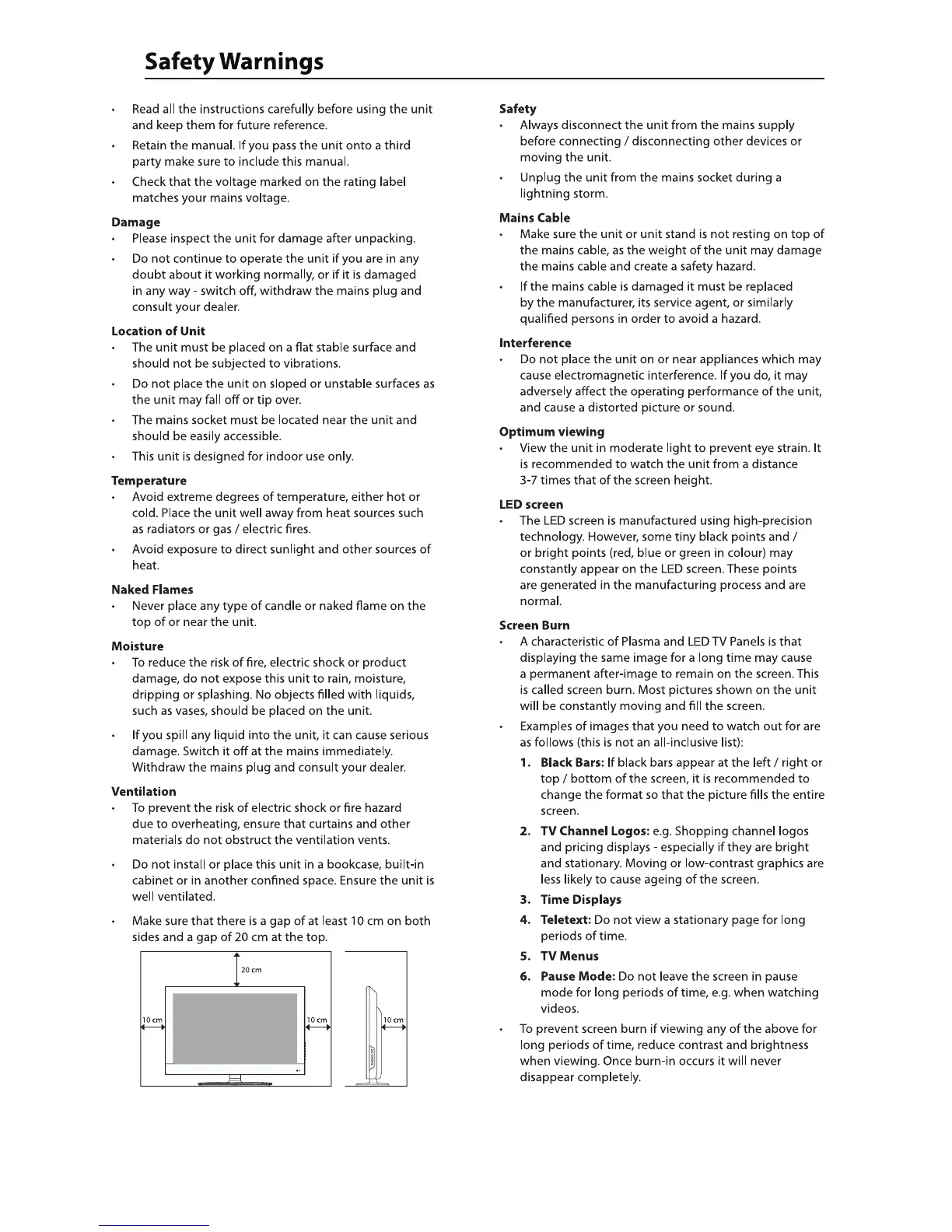 Cello C39222DVB-DLED - Safety Warnings; General Safety Precautions; Mains Cable, Interference, and Viewing; Screen Burn Prevention