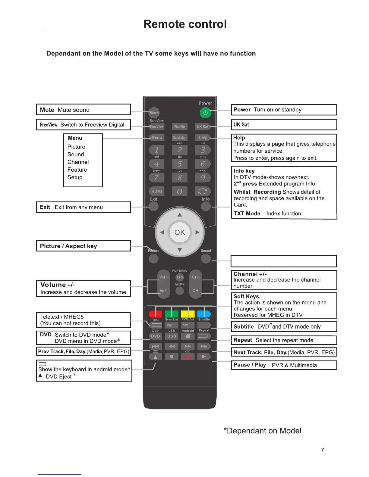 Cello C39222DVB-DLED - Remote Control Layout; Basic Operation Buttons; Navigation and Menu Access; Core Function Controls