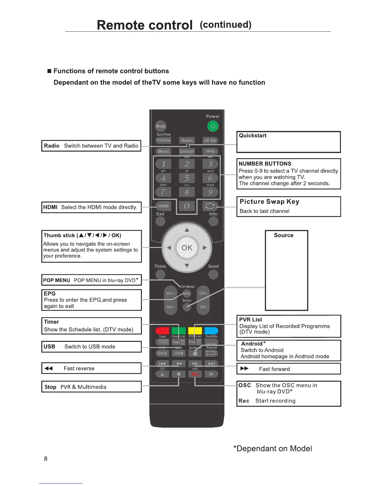 Cello C39222DVB-DLED - Remote Control Functions (Continued); Media Source and Recording Controls