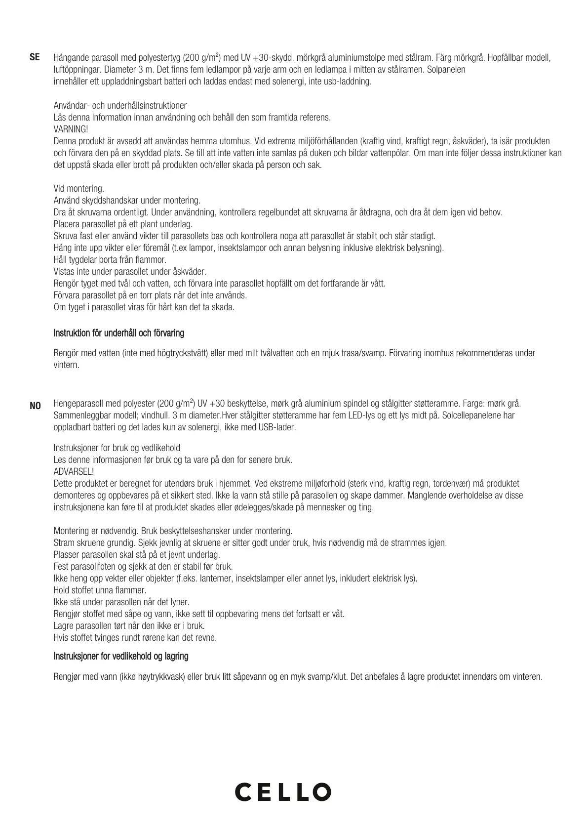 demonteres og oppbevares på et sikkert sted. Ikke la vann stå stille på parasollen og skape dammer. Manglende overholdelse av disse