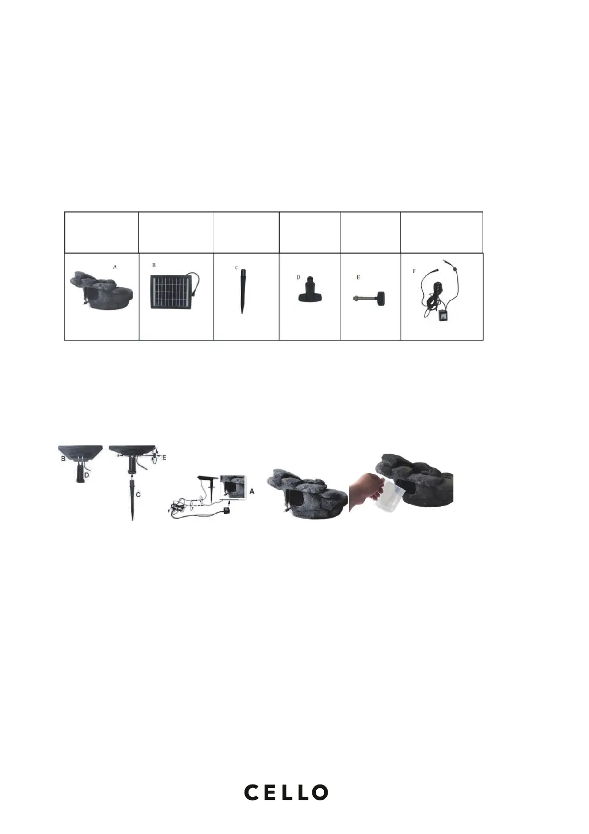 Steg 3. Monter pumpens kabel (F) til solcellepanelet (B) og fontenens LED-stripe (A).