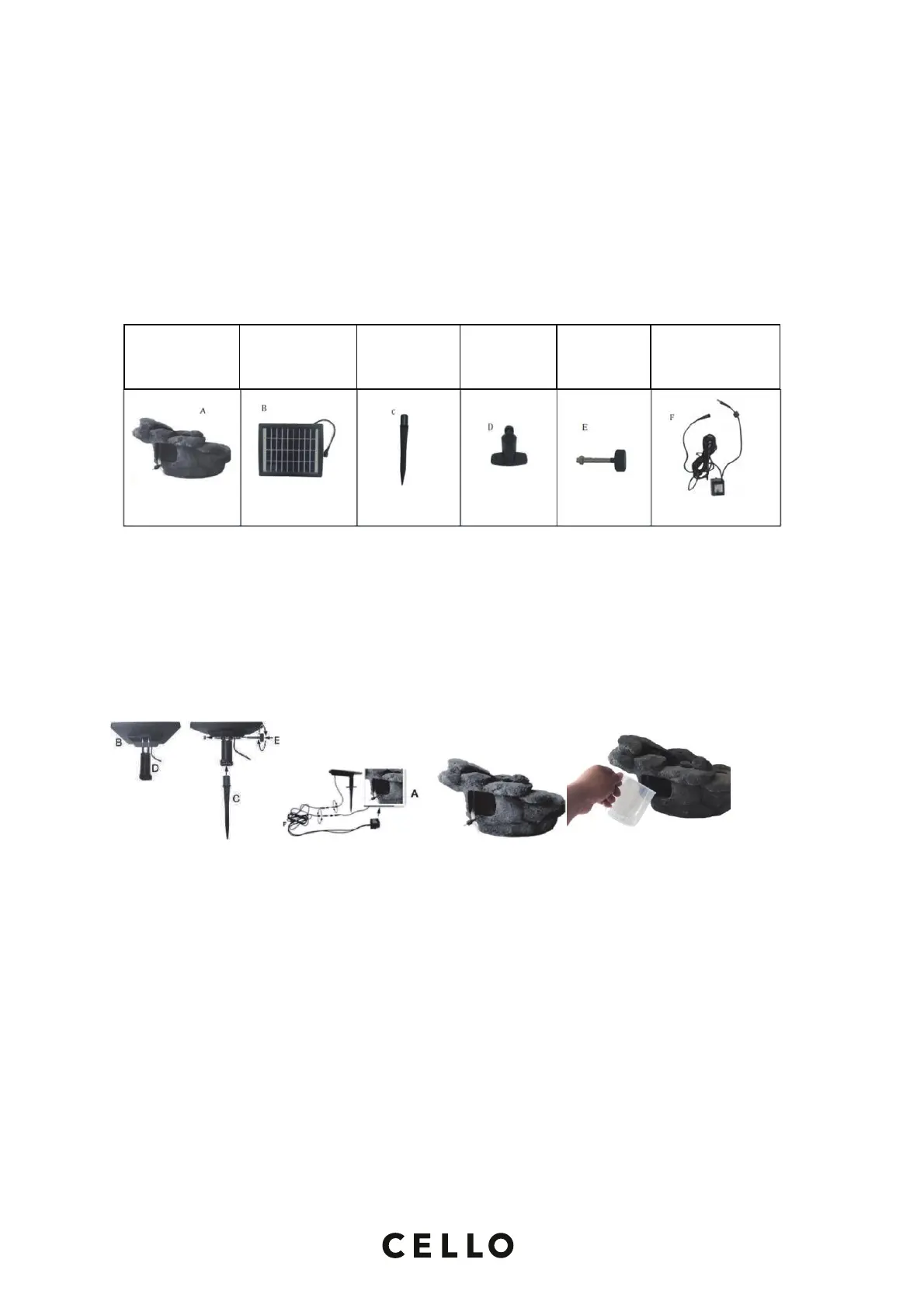 3. samm. Kinnitage pumba kaabel (F) päikesepaneeli (B) ja purskkaevu LED-riba (A) külge.