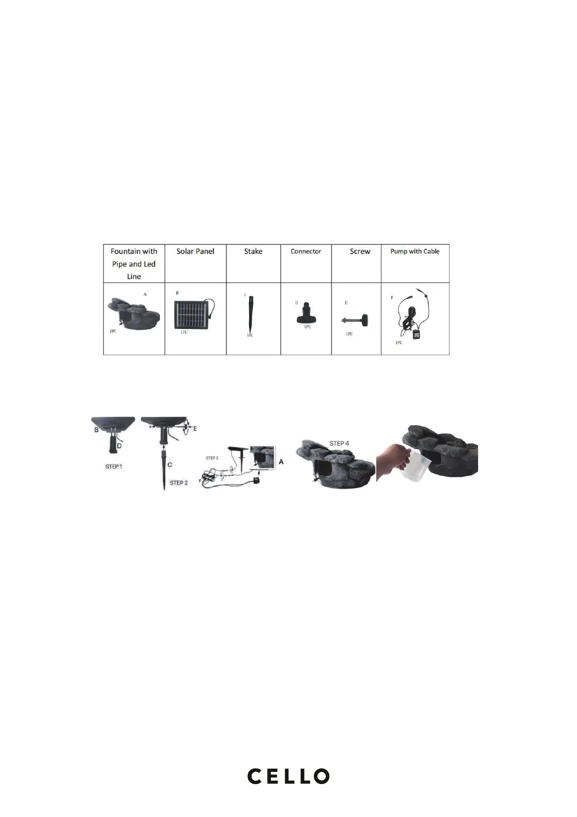 Step 3. Assembling cable of pump(F) to Solar Panel(B) and Fountain led line(A).