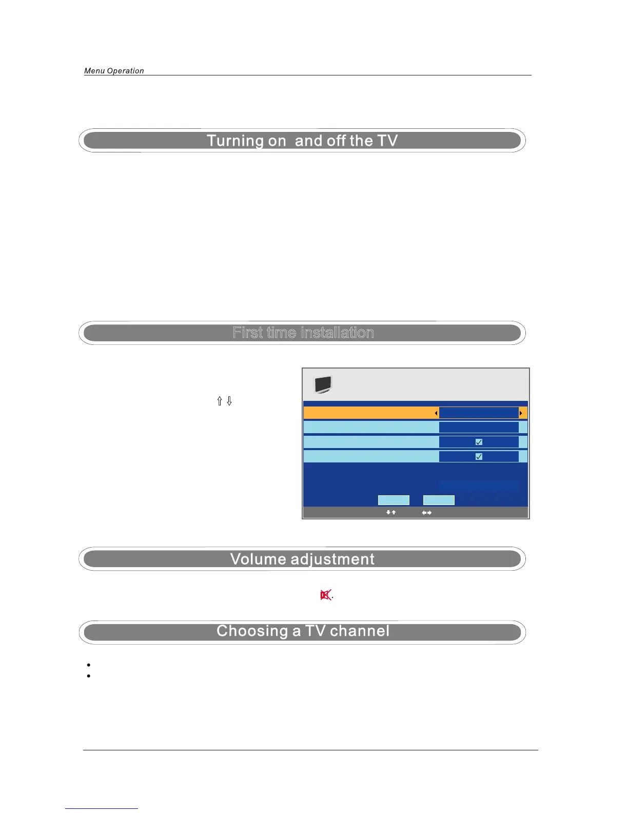 NOTE: When you initially use the TV, you will see the “First Time Installation” menu as below: