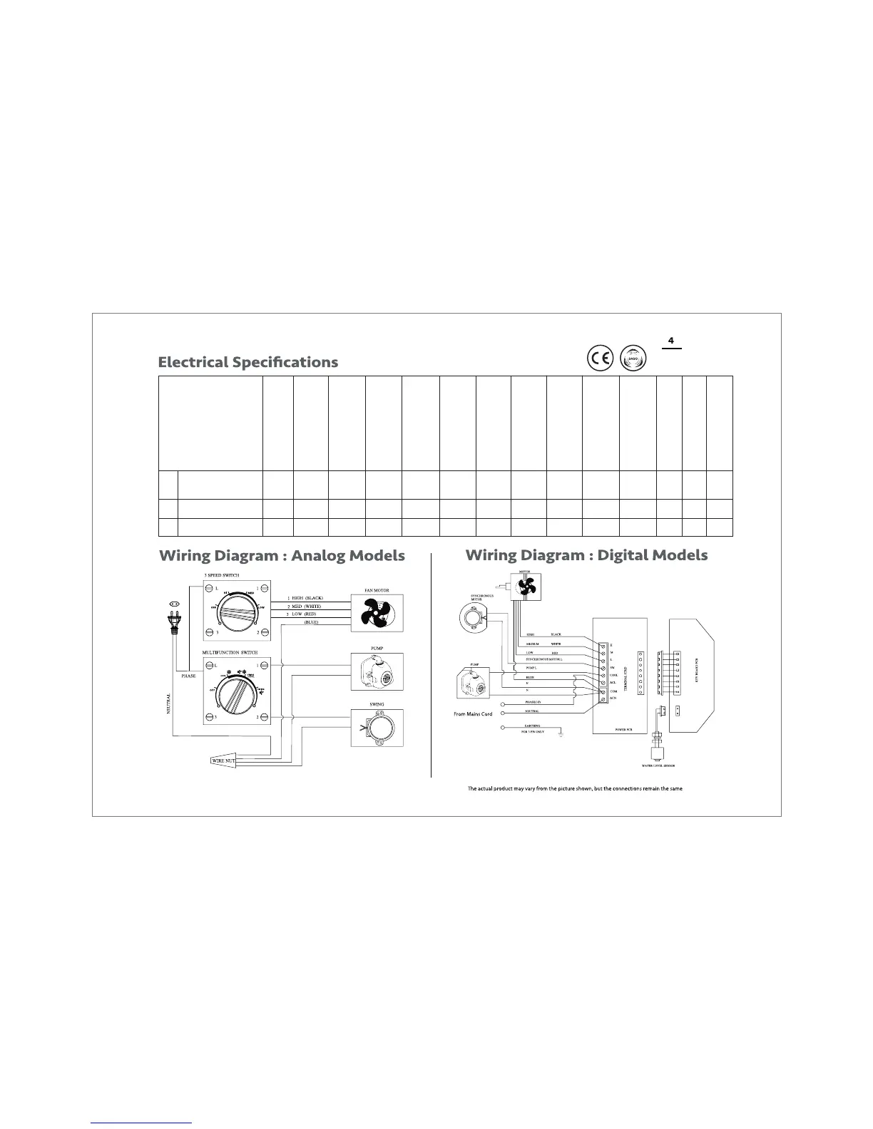 Cello WAVE - Electrical Specifications and Wiring; Model Specifications Table; Analog Models Wiring Diagram; Digital Models Wiring Diagram