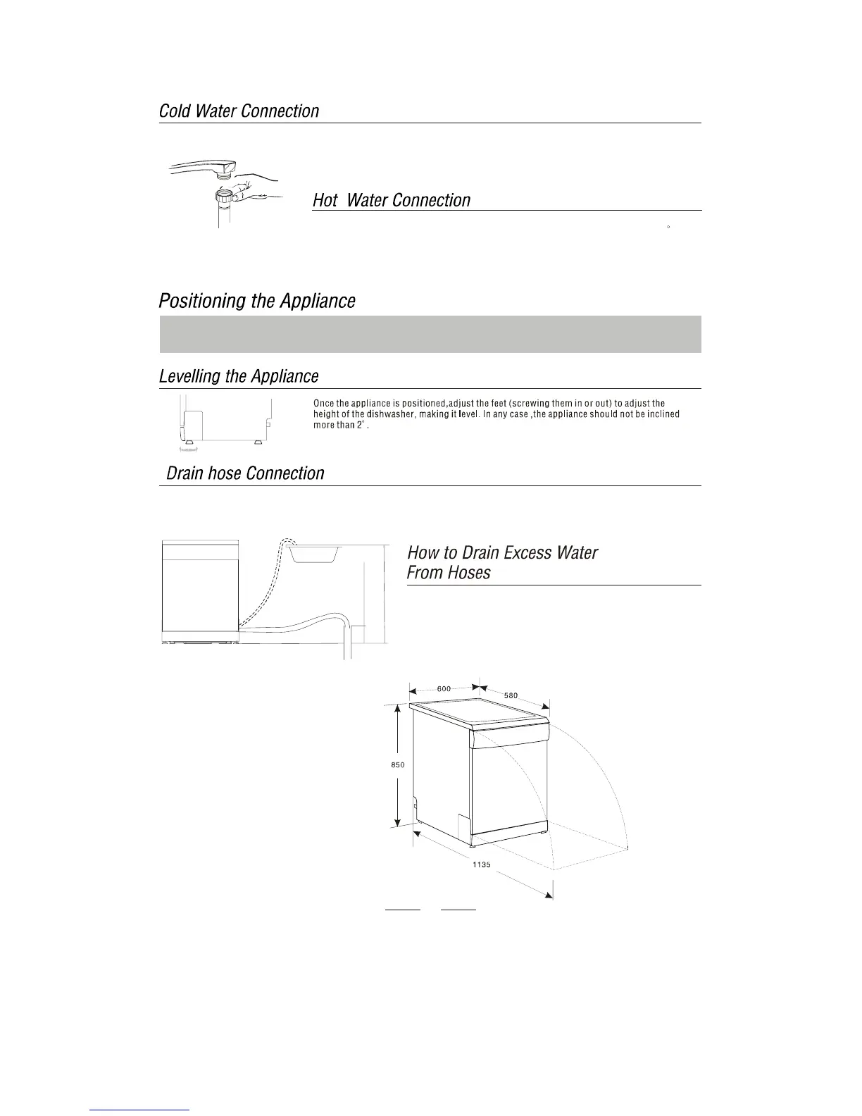 cabinets or wall. The dishwasher is equipped with water supply and drain hoses that can be positioned to the right or the left to