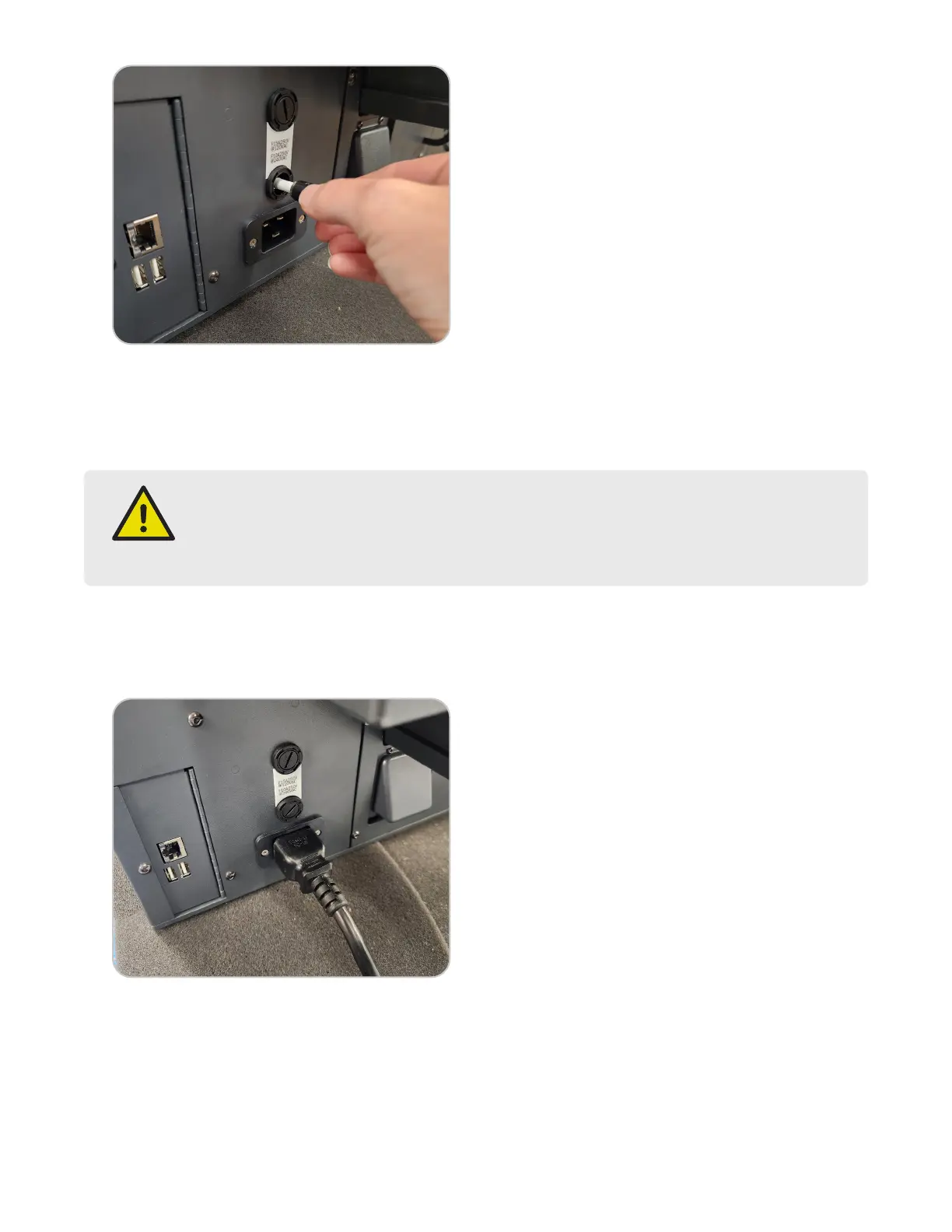 3. Plug the power cord into the back of the instrument and into a dedicated, grounded outlet. The instrument is