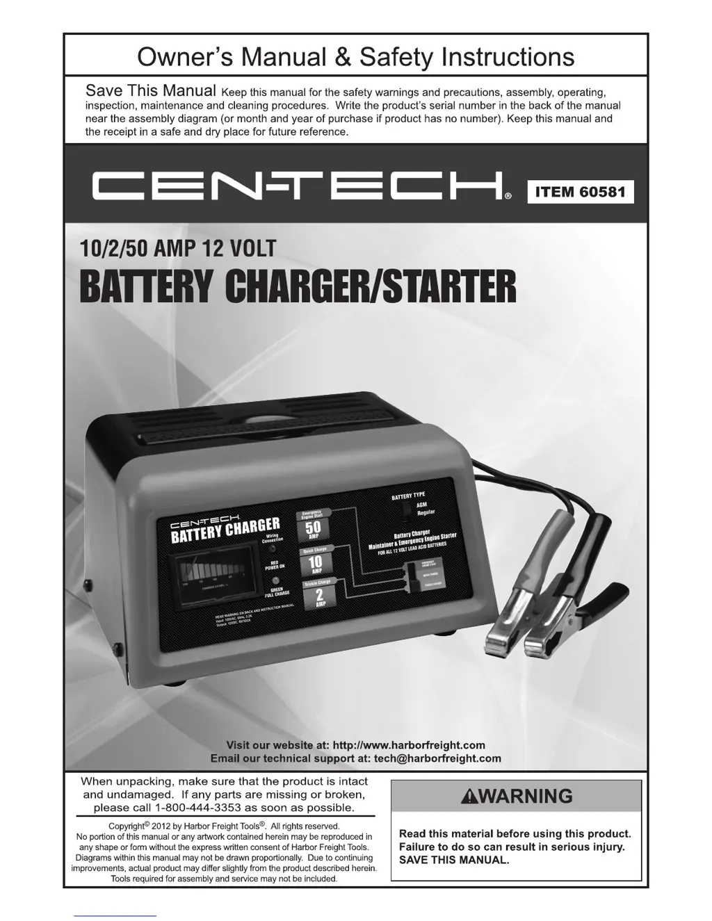 Your CEN-TECH Battery Charger might not be starting due to several reasons: 1. The cord may not be properly connected. Ensure the cord is securely plugged in. 2. There might be no power at the outlet. Check the outlet for power. If it's unpowered, turn off the charger and check the circuit breaker. If the breaker is tripped, verify that the circuit has the correct capacity for the charger and isn't supporting other loads. 3. The clamps may not be securely connected to the battery terminals. Unplug the charger and double-check that the clamps are firmly attached to the battery terminals.