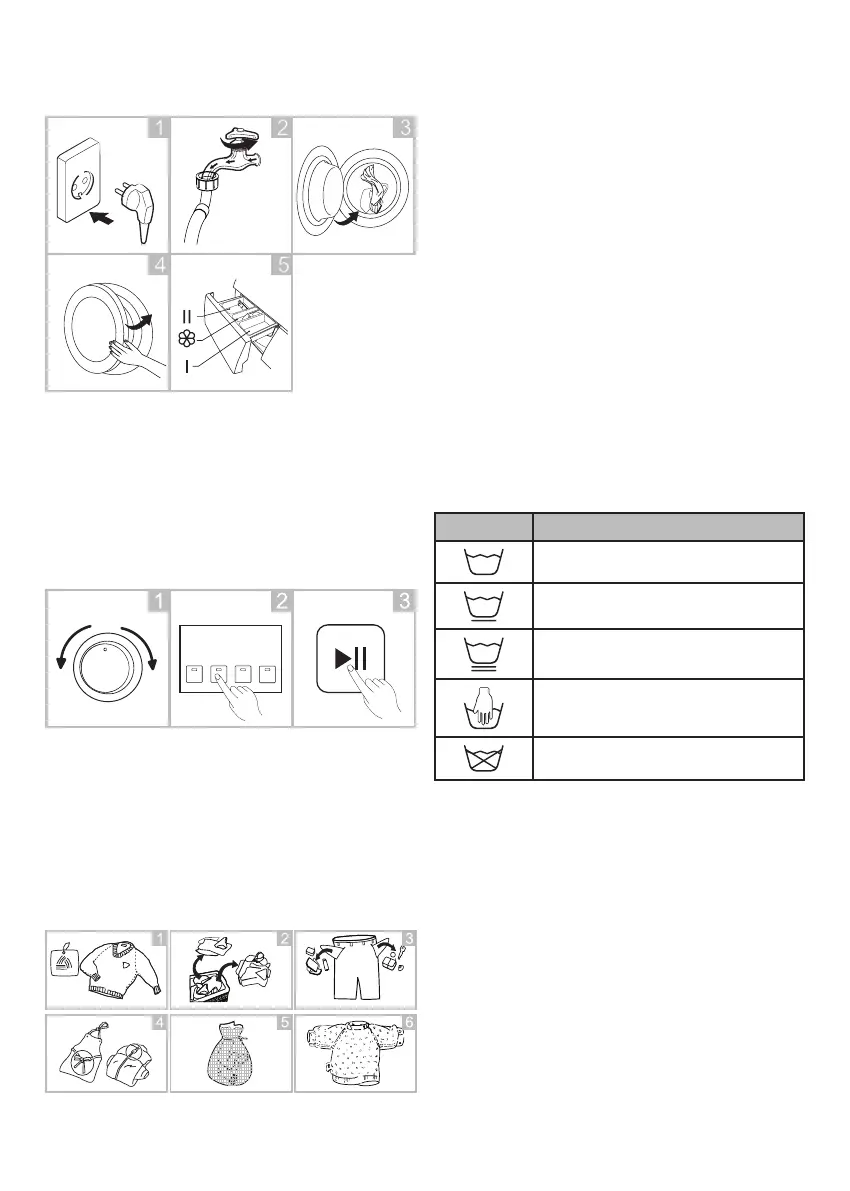 – Түс (ақ, түсті маталар, қою түсті маталар): Ақ киімді түсті киімнен бөліп
