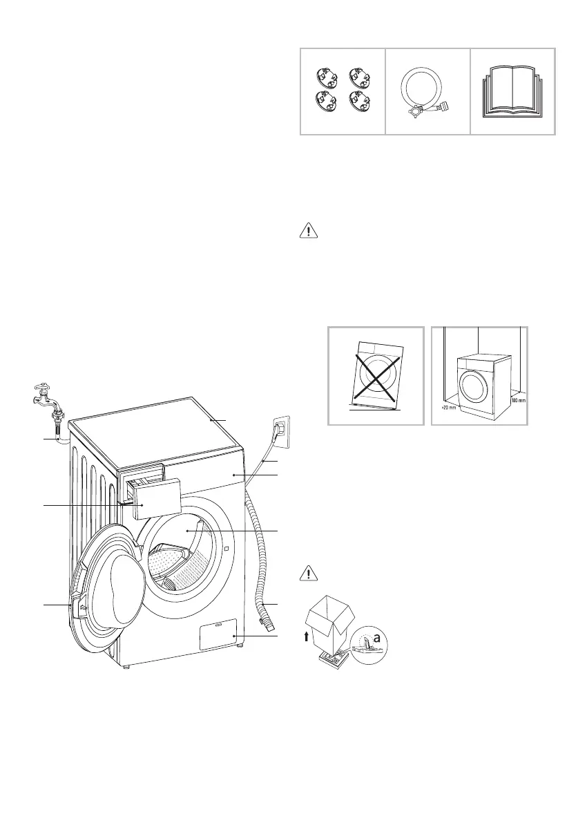 2. Lift the washing machine and remove the packaging from its base. Ensure that