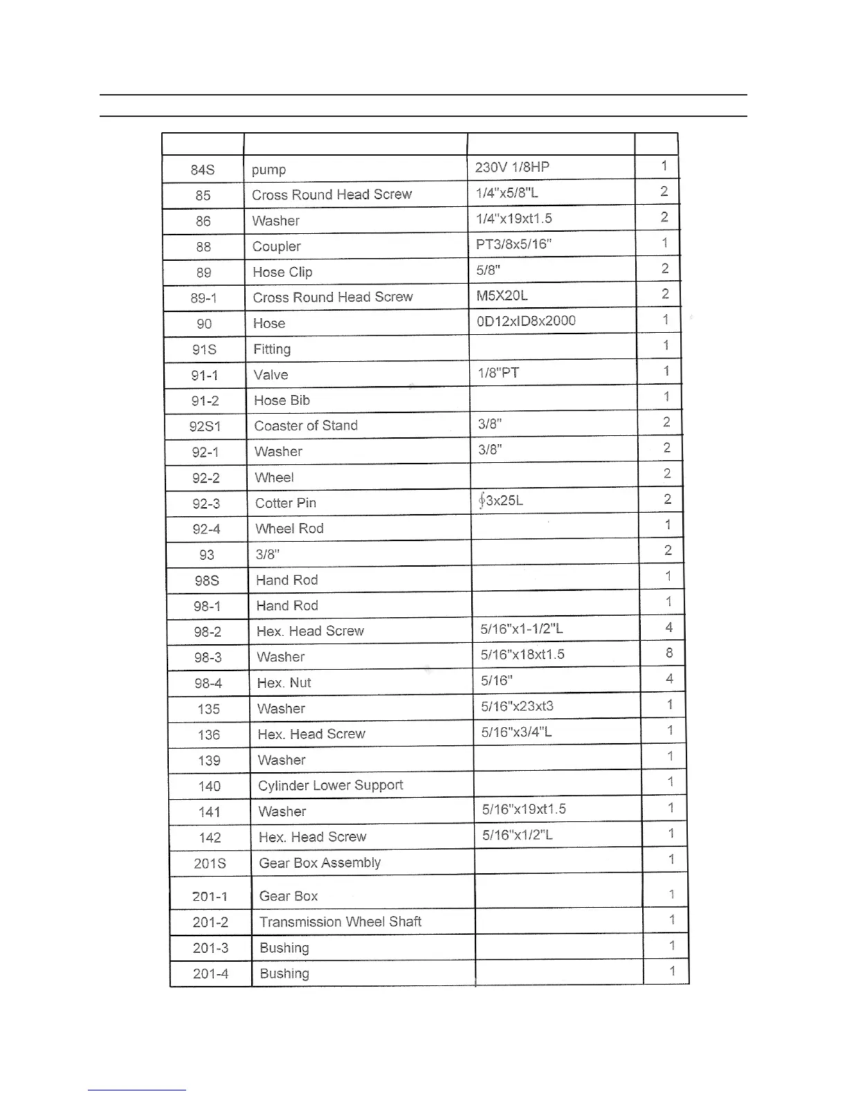 Part Description Specications Qty.