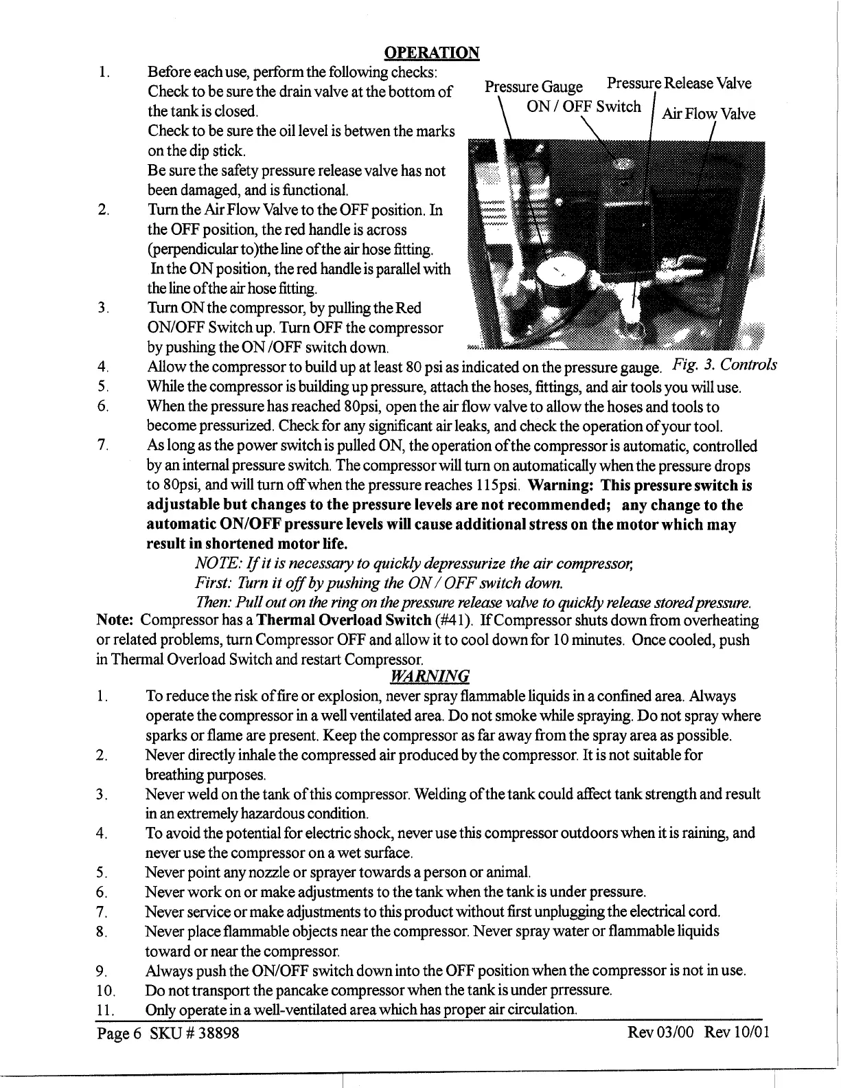 Central Pneumatic 38898 - Operation Procedures; Pre-Operation Checks and Valve Control