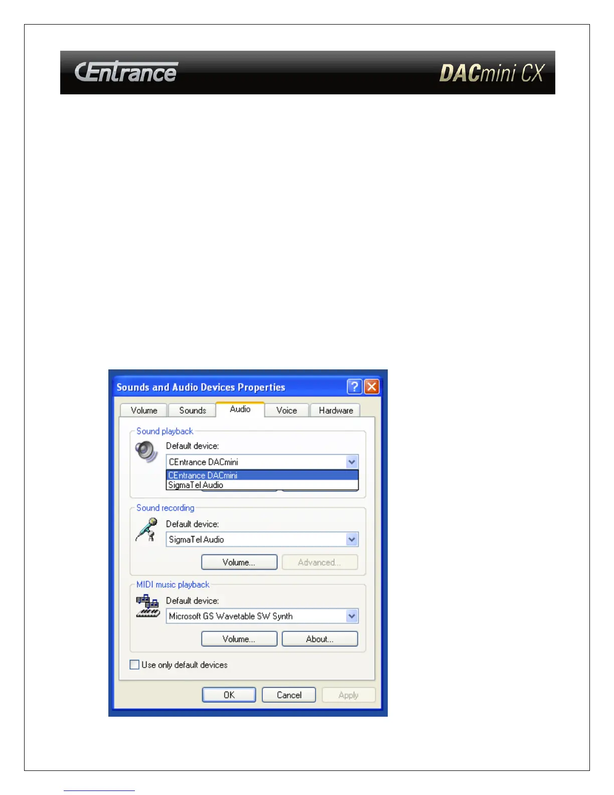 3. Select the “Audio” tab and make sure CEntrance DACmini is the