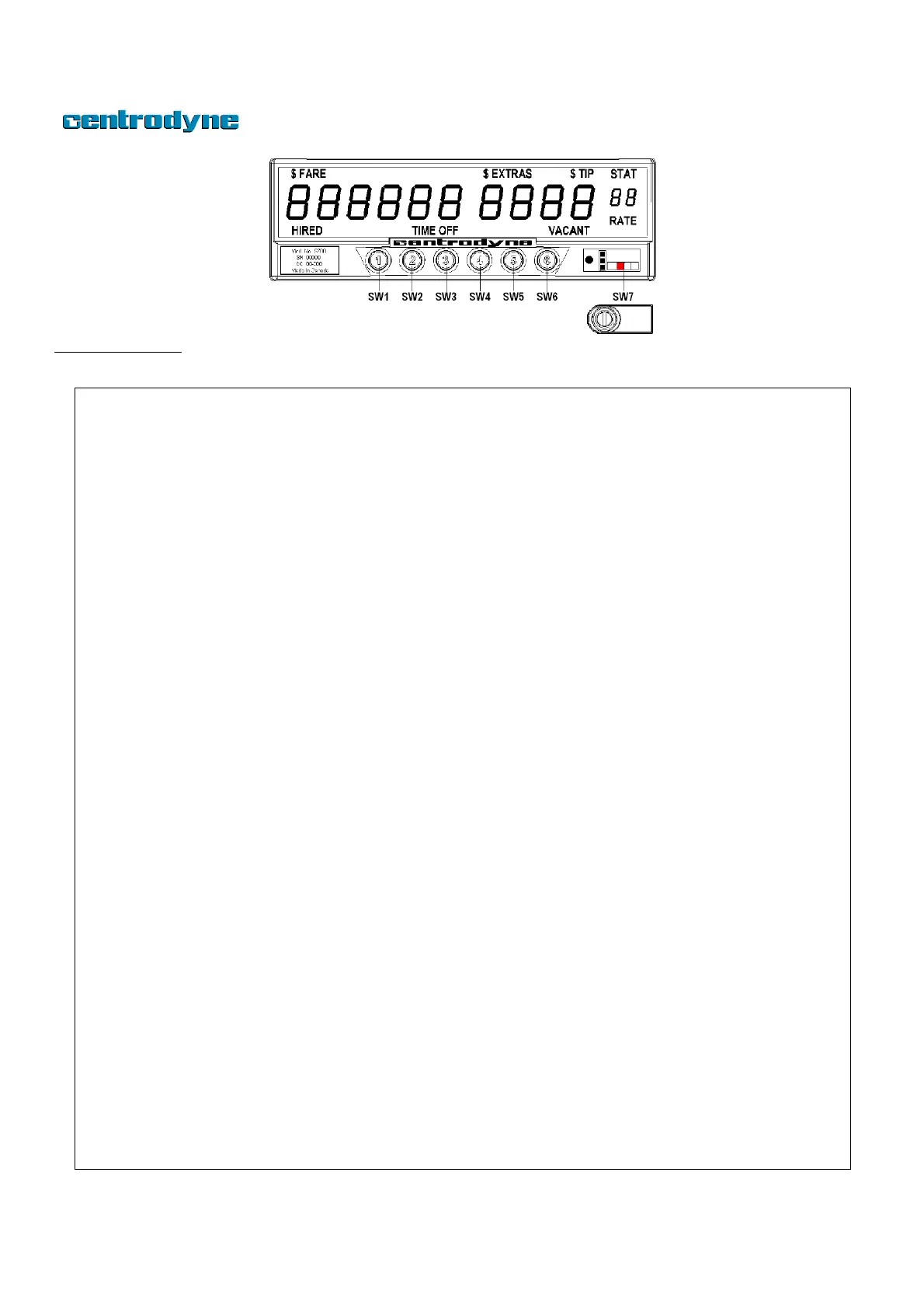 Operation of the taximeter is controlled by the 6 switches (SW1 to SW6) on the face of the taximeter.