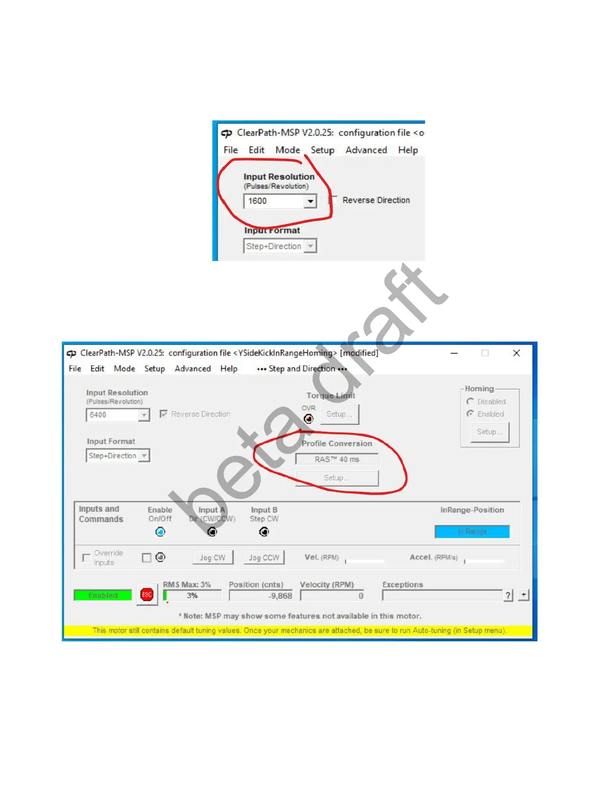 Note: Even for the 800 step per rev model Clearpath motor, Set the Input Resolution to a minimum of