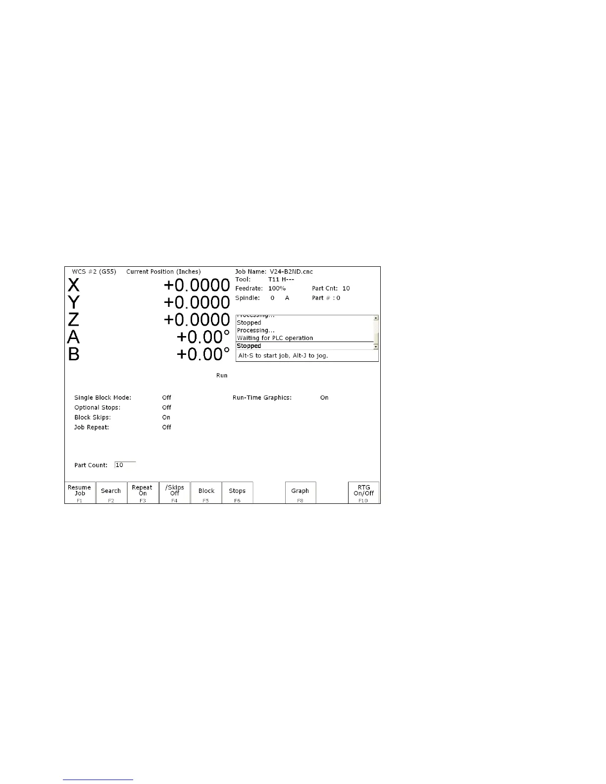 mode on and off, turn optional stops on or off, graph the partially completed job, or start the