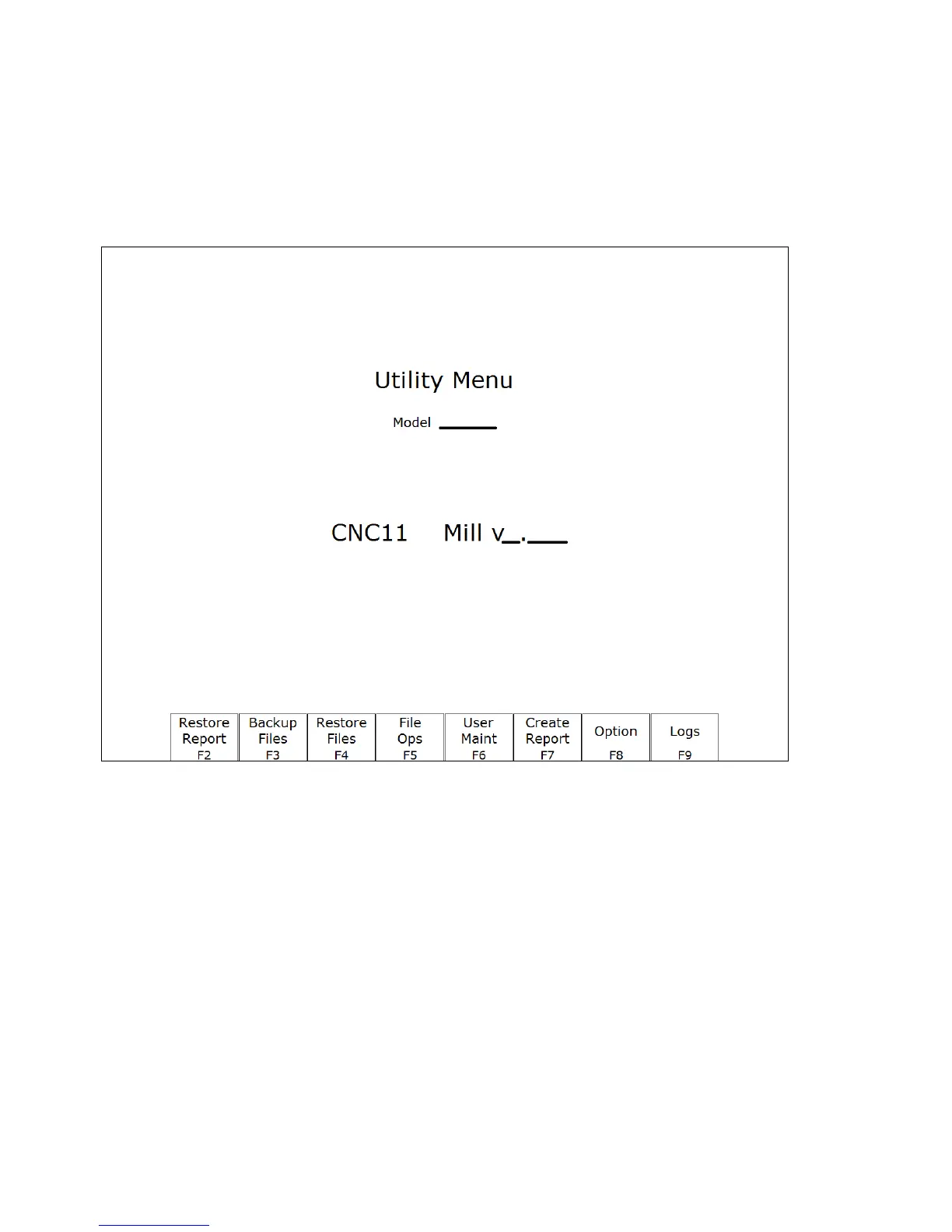 To get to the Utility Menu, press F7 - Utility at the CNC software Main Screen. The model will vary depending on
