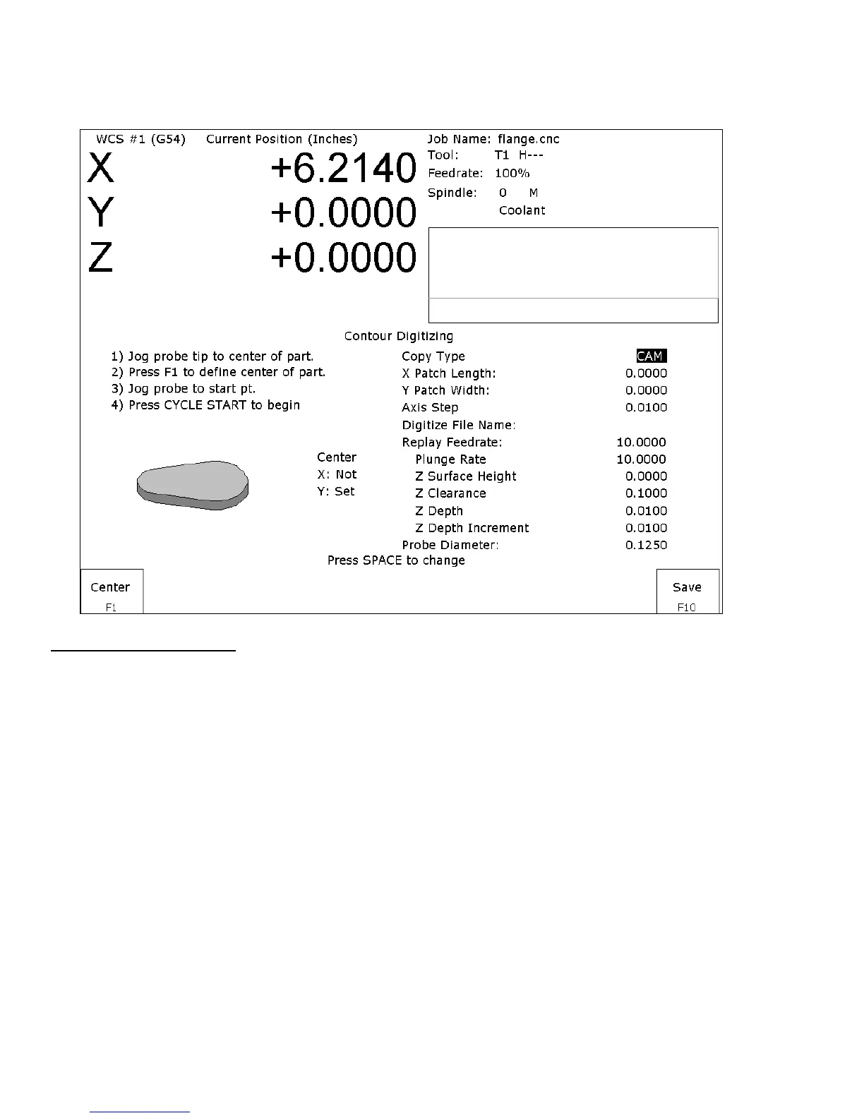To set up a digitizing run, jog the probe tip to the center of the part and hit F1 - Center to assign that as your center
