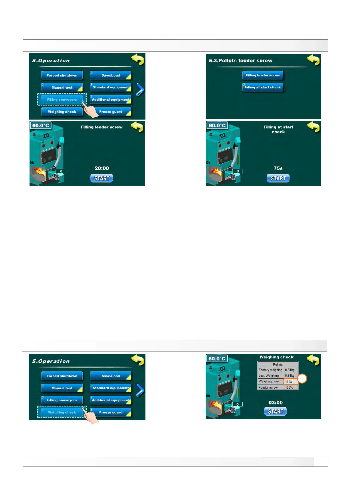 This option is used to control the initially filling of the burner. By pressing the "START" key the transporter will start