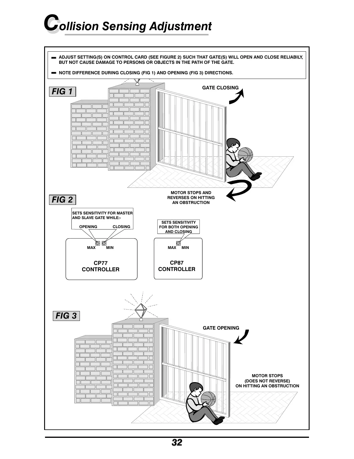 ADJUST SETTING(S) ON CONTROL CARD (SEE FIGURE 2) SUCH THAT GATE(S) WILL OPEN AND CLOSE RELIABILY,