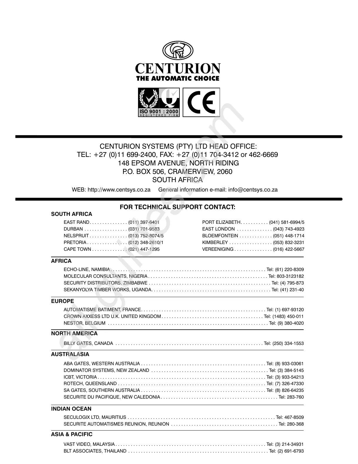 CENTURION SYSTEMS (PTY) LTD HEAD OFFICE: