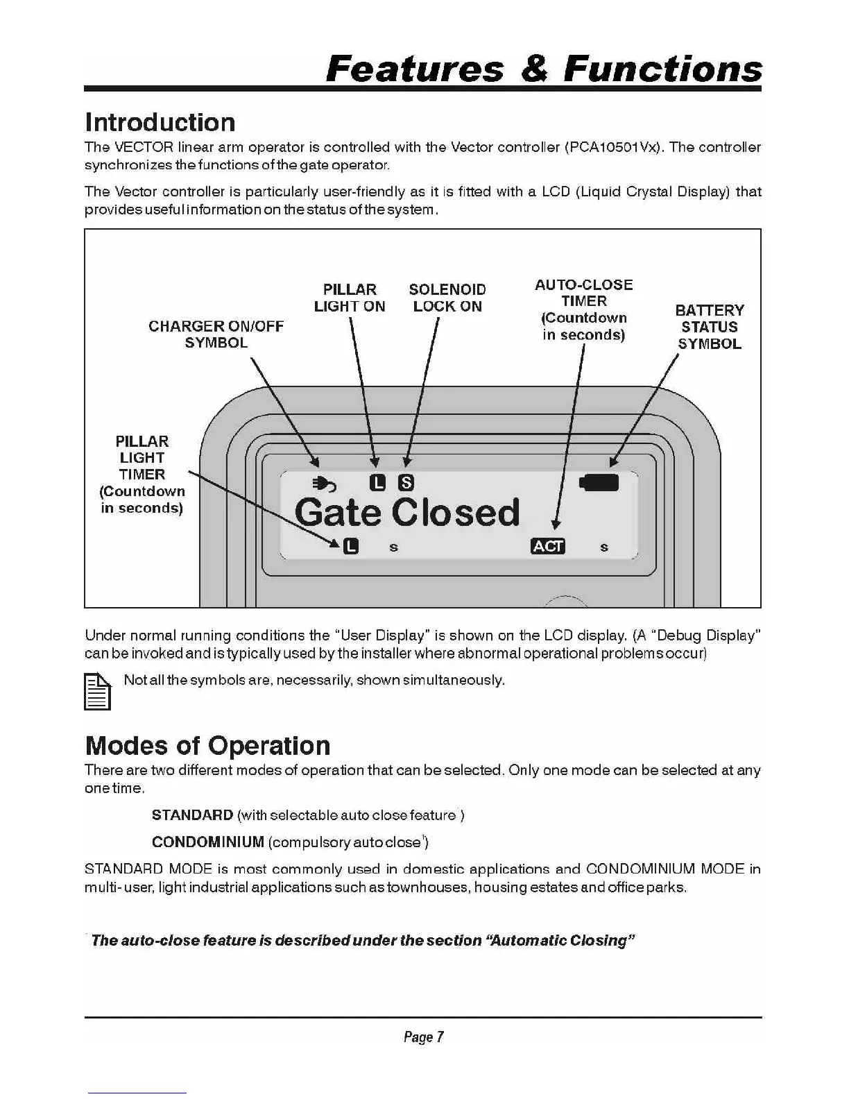Centurion Vector - Features and Functions Overview; Controller and Display Introduction; Gate Operation Modes