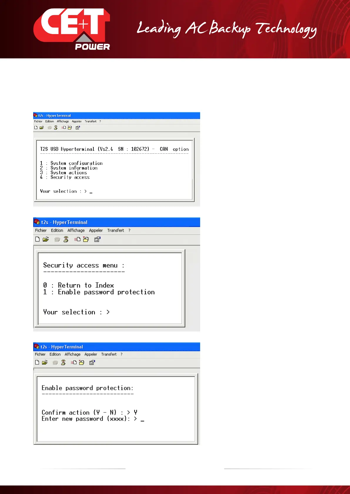To secure access to Menu of T2S, use HyperTerminal as explained before. Available since SW 2.4 version