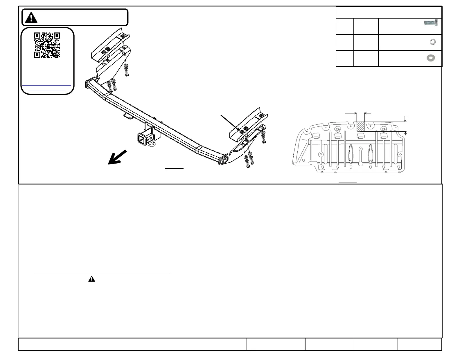 8. Soulever l'attelage : Soulever l’attelage en position et installer les boulons hexagonaux, les rondelles freins et les rondelles plates dans les écrous à souder existants du cadre de châssis, comme illustré ci-
