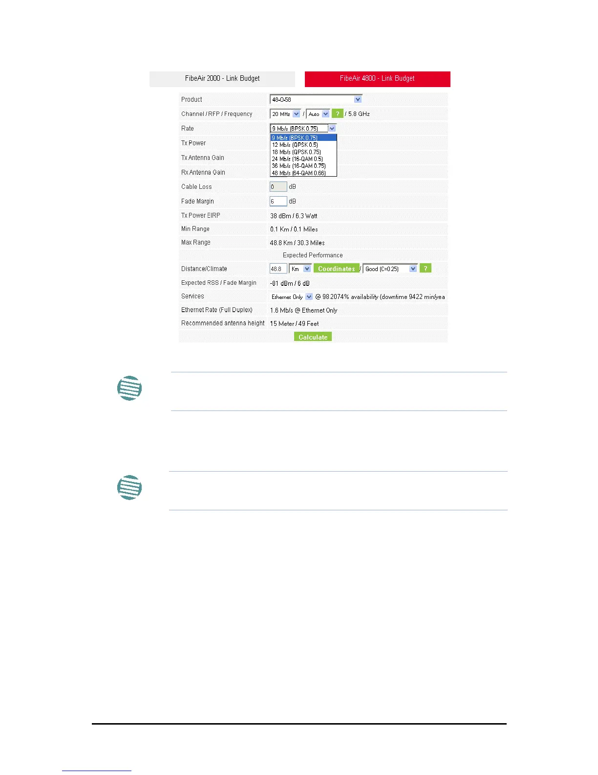 The Rate shown, defines the air-interface rate in Mbps. The system operates in TDD