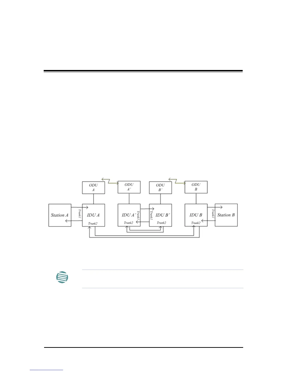 The trunk to backed up is shown as Trunk2, from IDU A to IDU B. The first hop is from ODU
