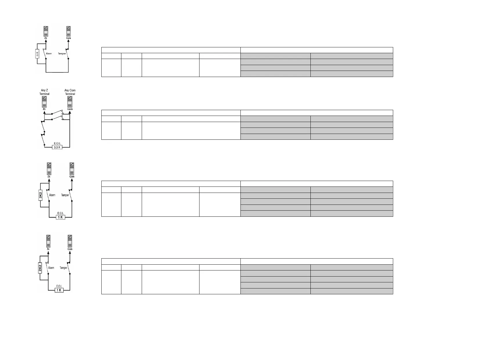 If your security installation requires tamper (open circuit) and wire fault (short circuit) recognition, connect the detection devices with a 1K end of line (EOL)
