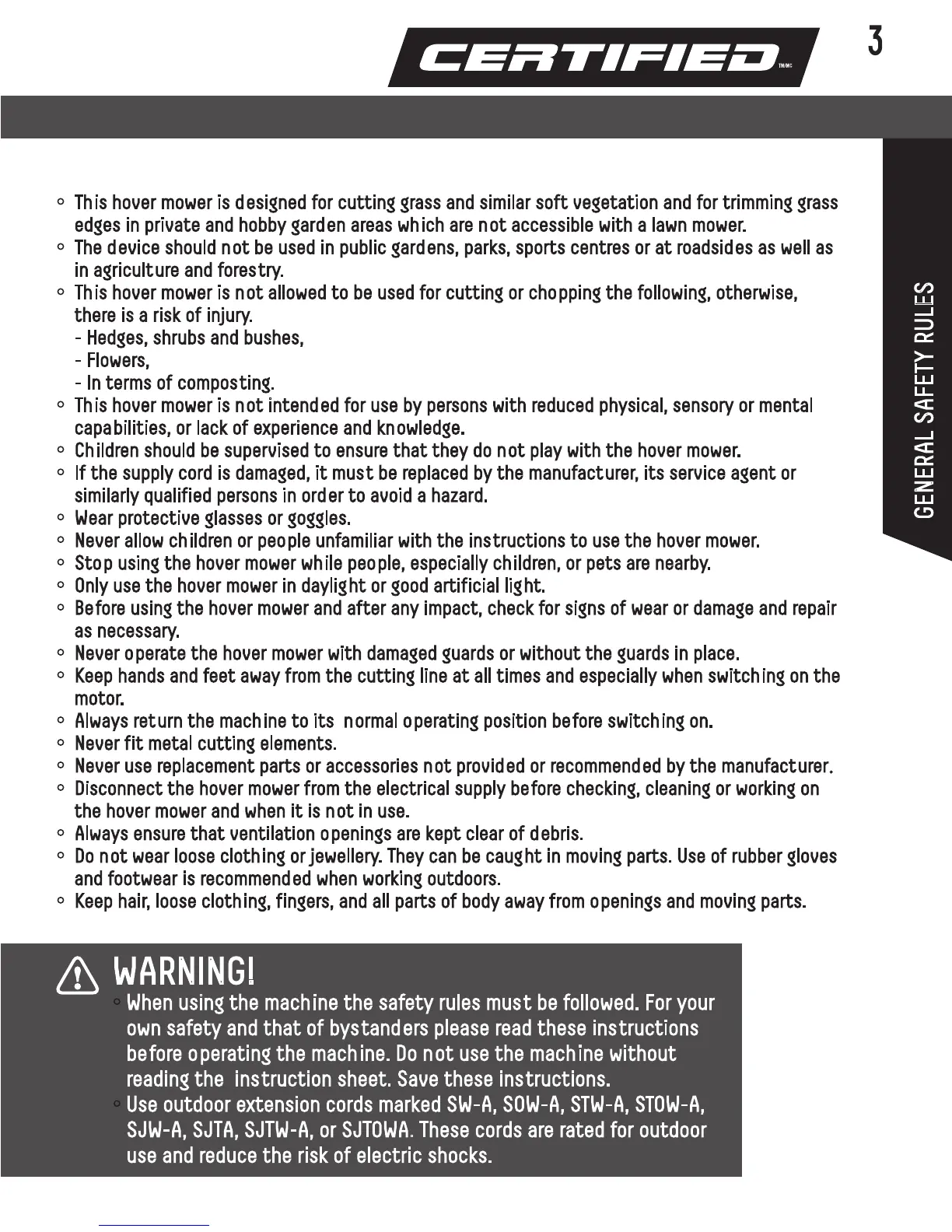 • Never allow children or people unfamiliar with the instructions to use the hover mower.