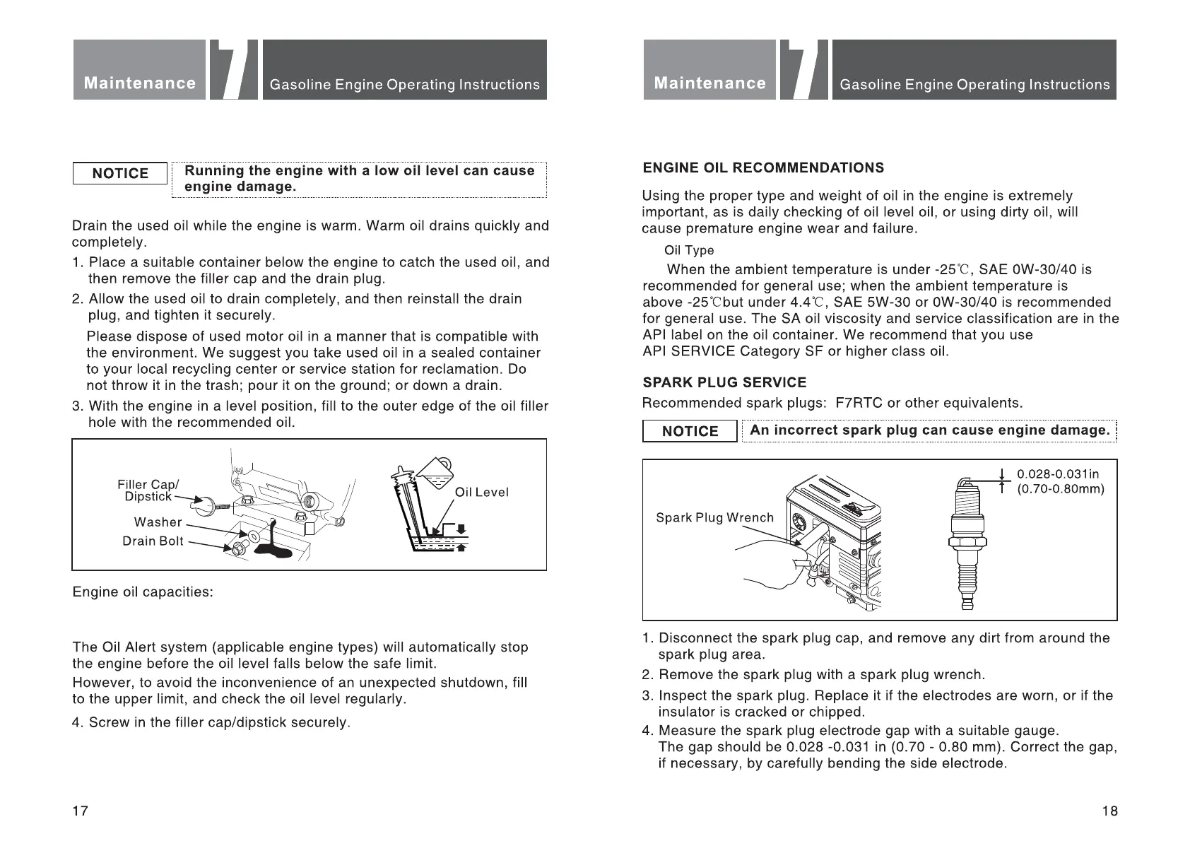CERTIFIED 212cc - Engine Oil Change Procedure; Engine Oil Recommendations; Spark Plug Service and Replacement