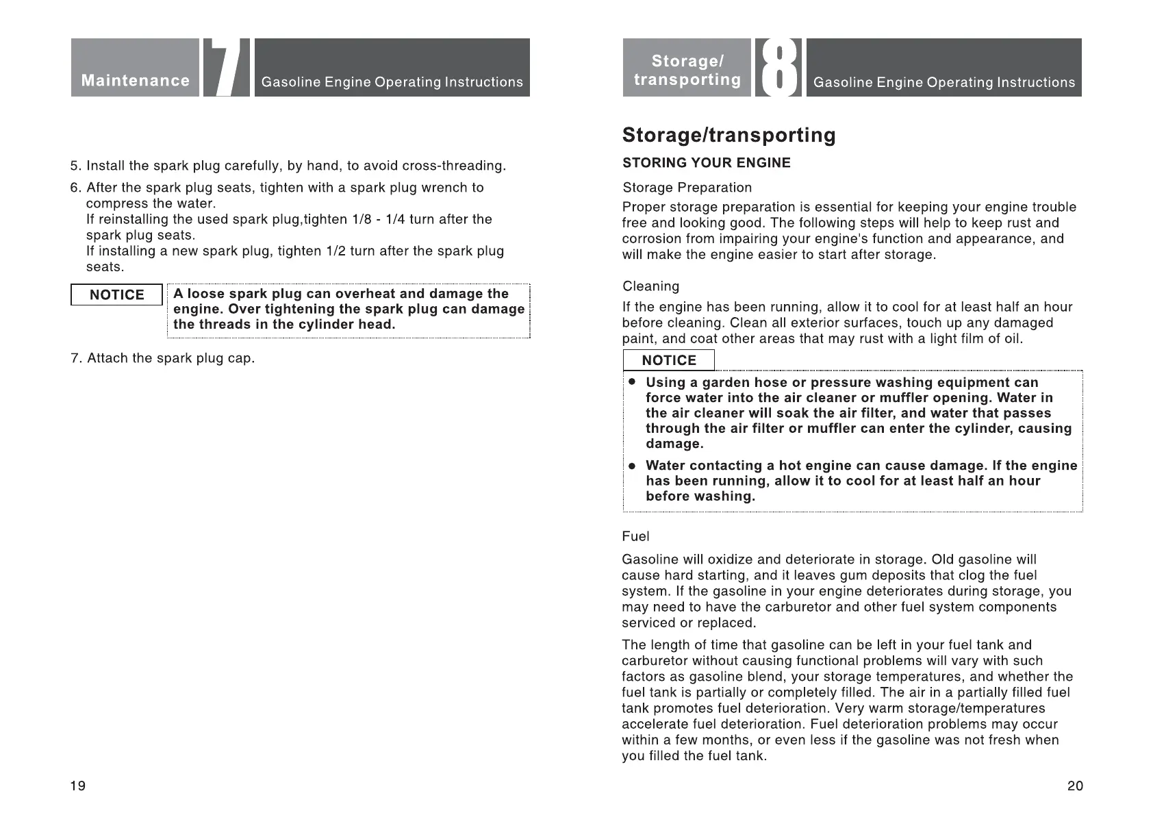 CERTIFIED 212cc - Spark Plug Installation Guide; Storage and Transport; Engine Storage Preparation; Engine Cleaning for Storage