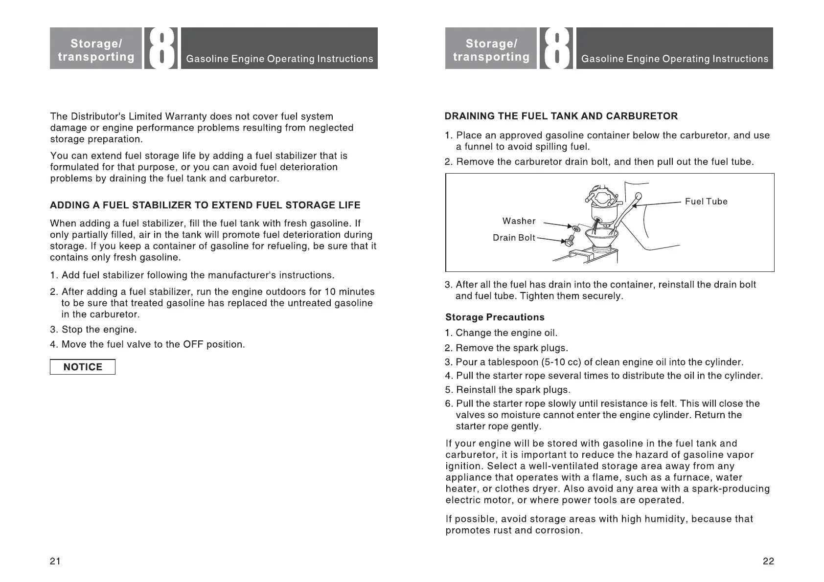 CERTIFIED 212cc - Using Fuel Stabilizer for Storage; Draining Fuel Tank and Carburetor; Additional Storage Precautions