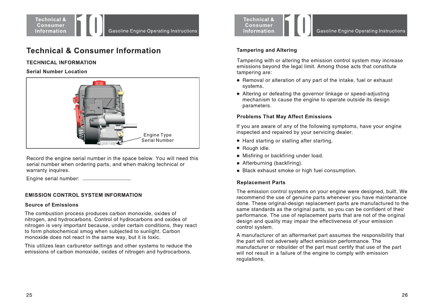 CERTIFIED 212cc - Technical and Consumer Information; Technical Information: Serial Number; Serial Number Location; Emission Control System Details