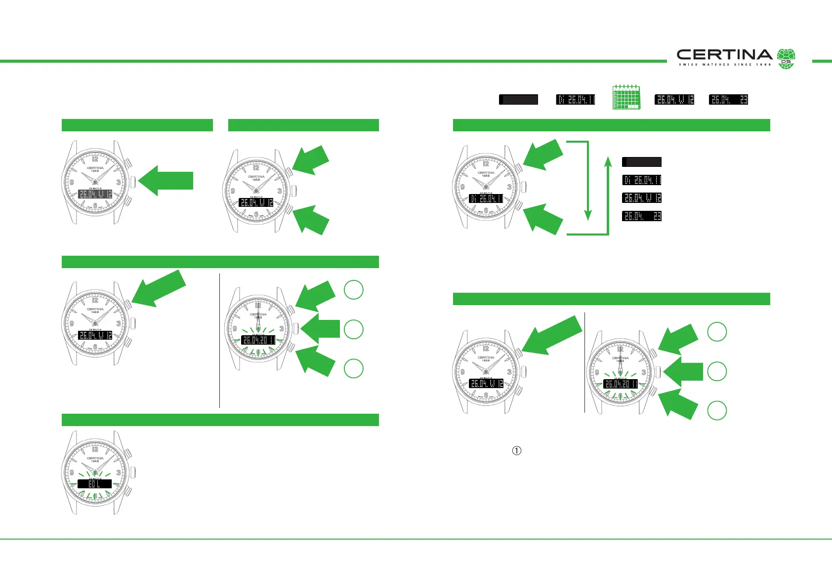 Note: The date cannot change if the hands are displaying T2. In this case, the display will indicate