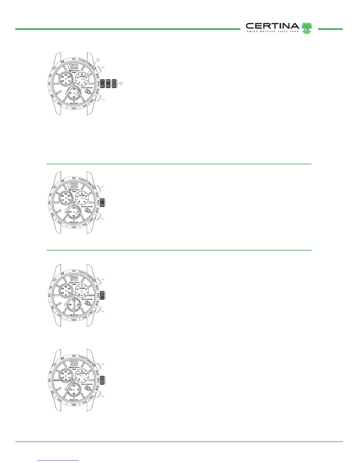 NB: Before each timing operation, the chronograph hands must be at their start points. If necessary, refer to