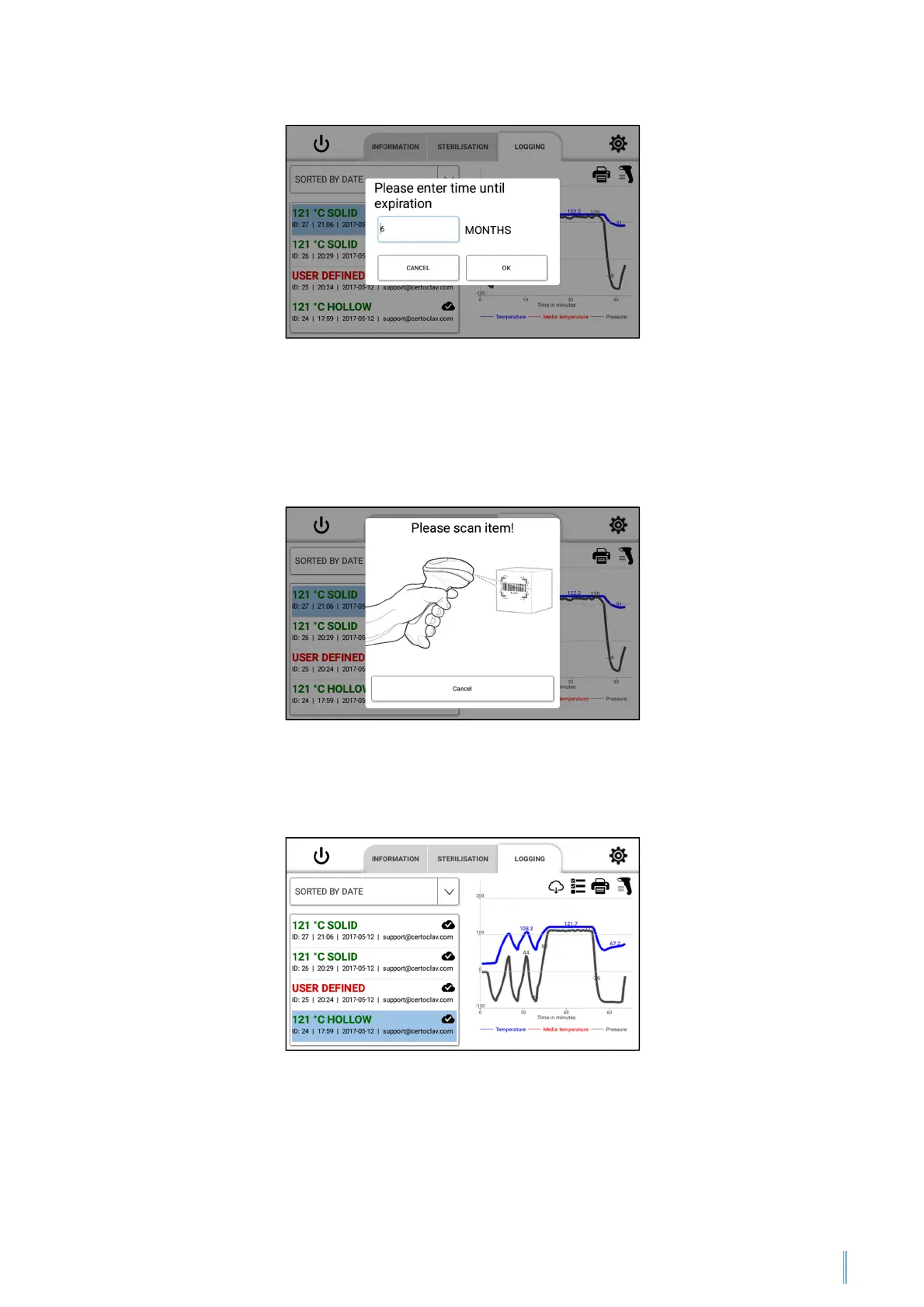 A dialog window appears. Scan the barcode of the sterilised product with the barcode