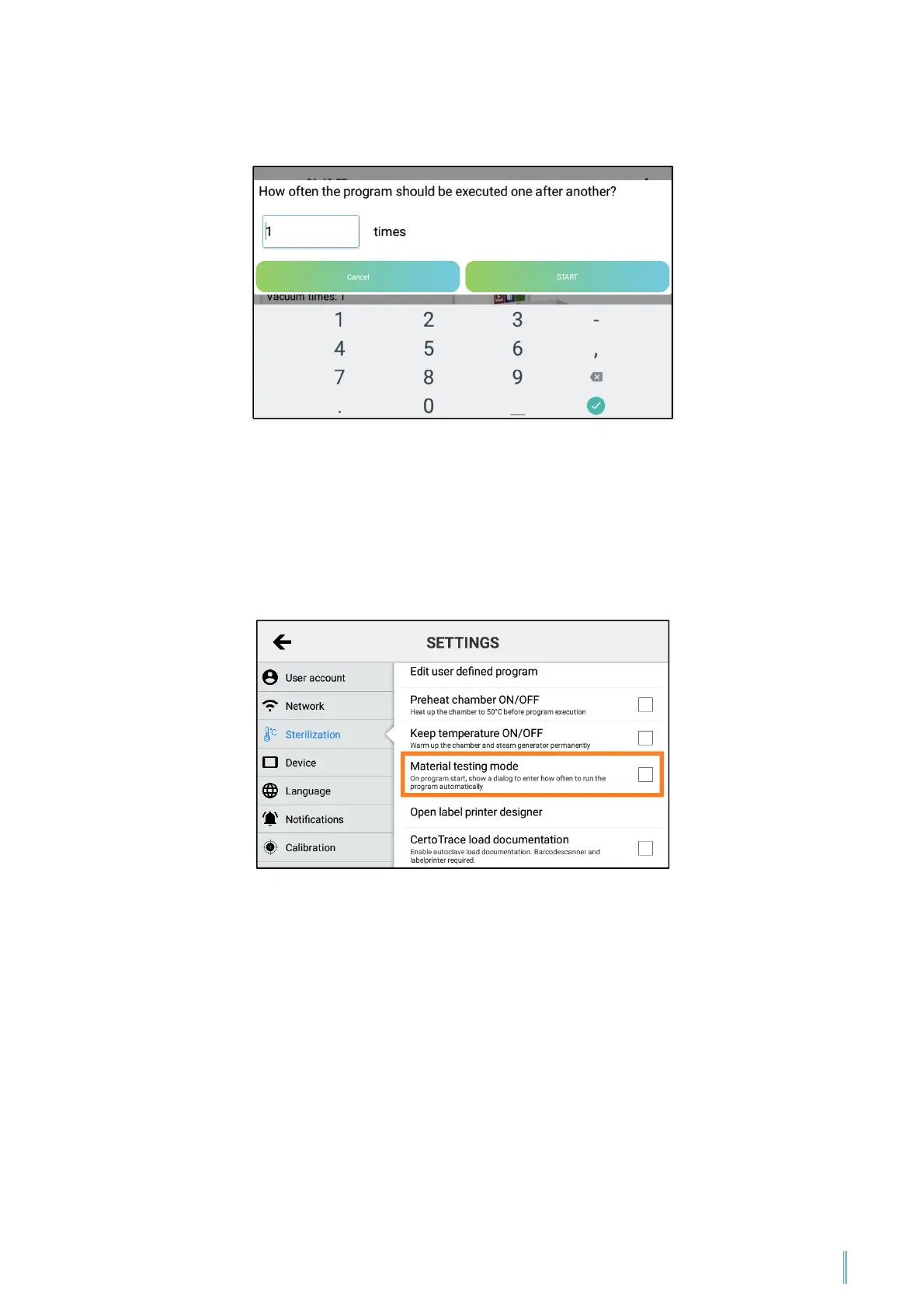 If Material Test Mode is activated, you will be asked how often a program is to be