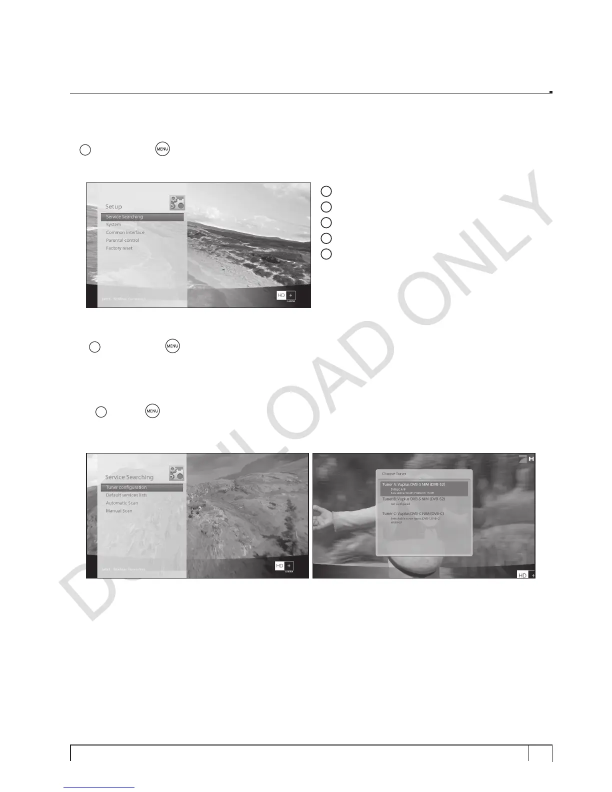 > Setup > Service Searching > Tuner Configuration]