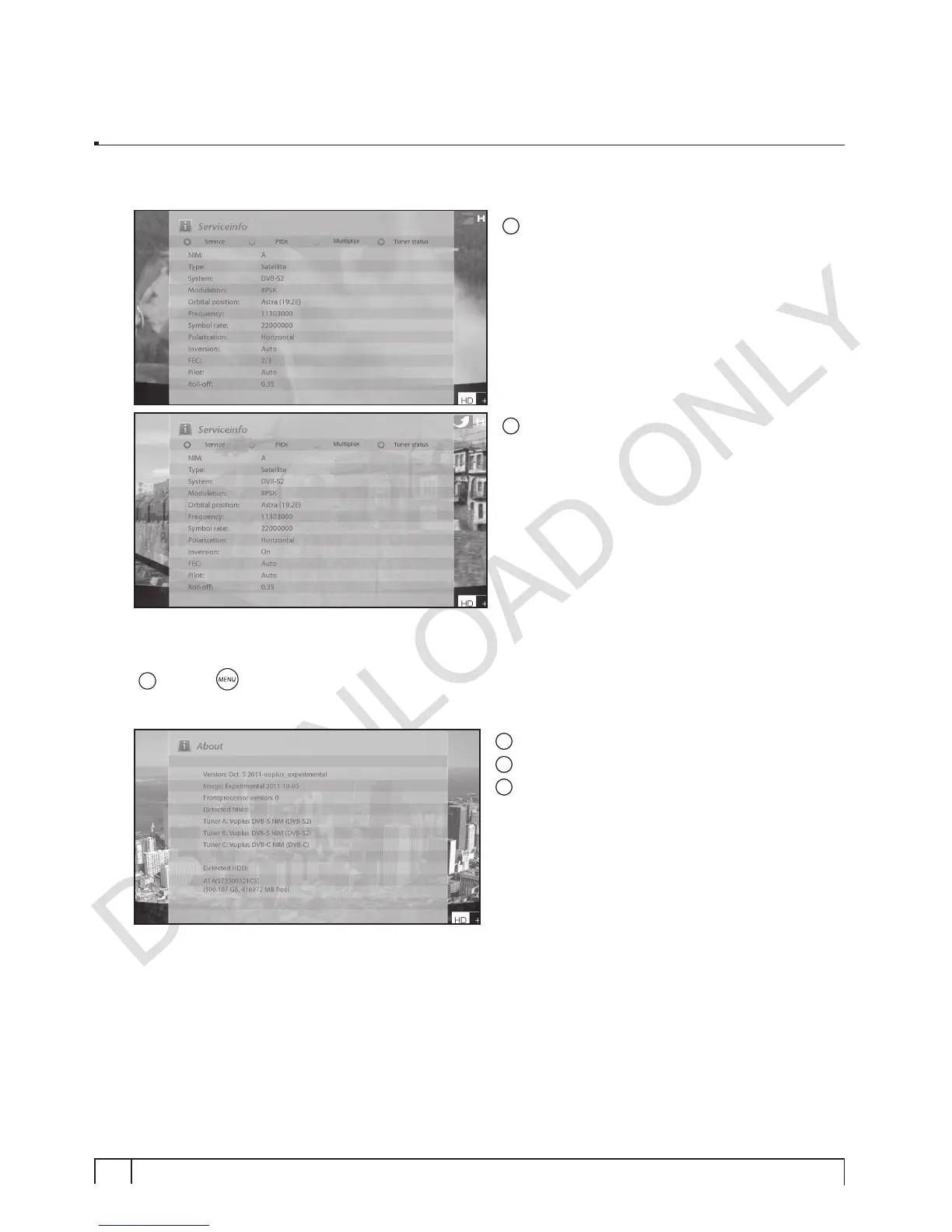 This menu is for you to check the current system of your Vu+. You can see the following information: