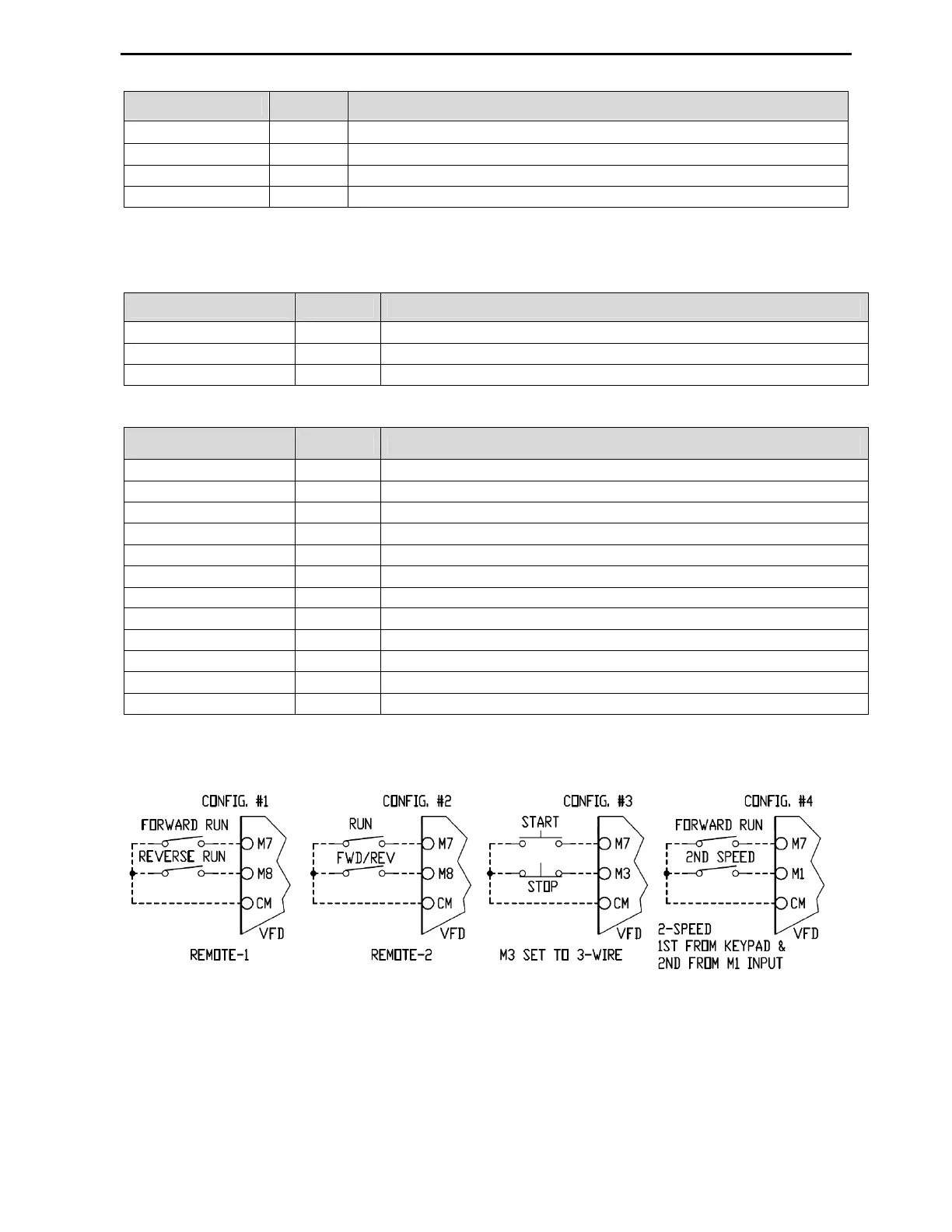 Config. #1 shows VFD controlled by separate Forward and Reverse inputs when SET-09 parameter is set to