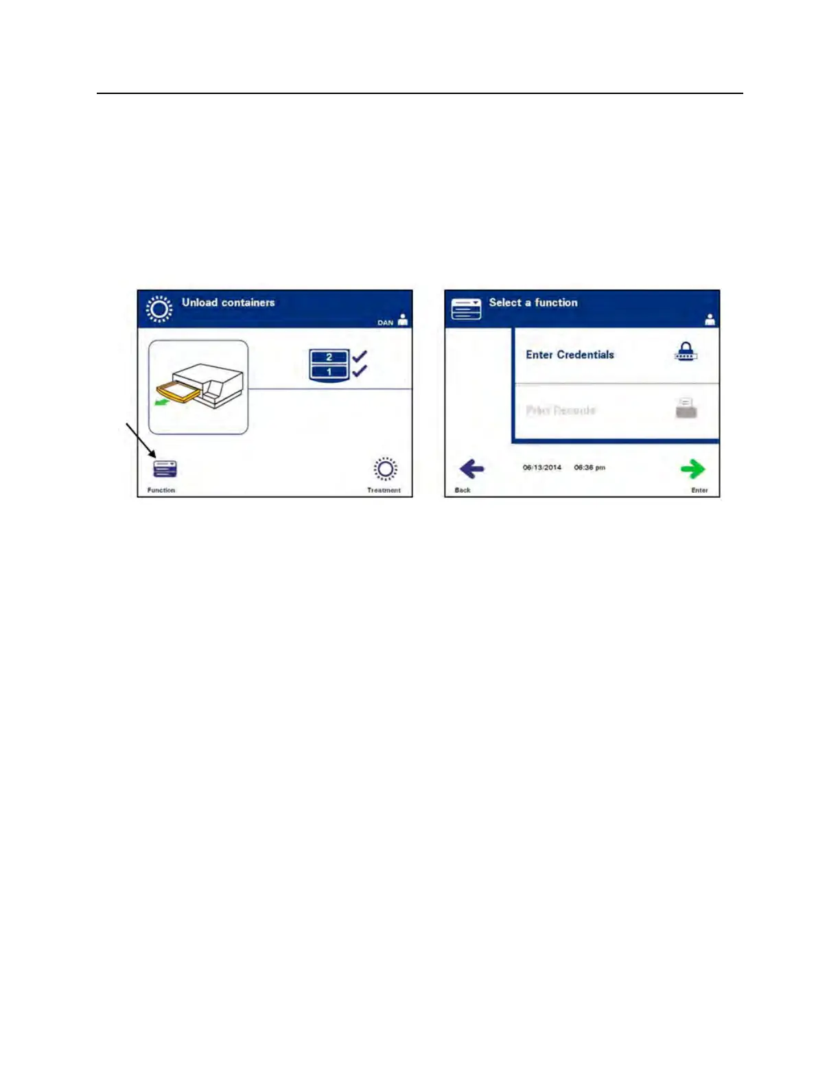 Unload containers screen has two softkeys: Function on the left