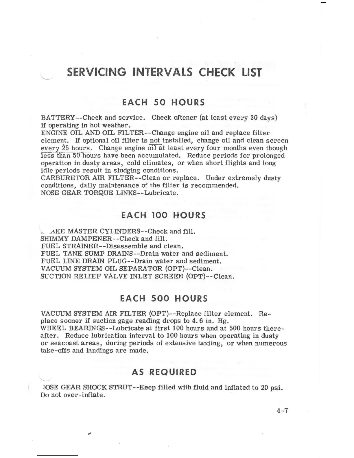Cessna 150 - SERVICING INTERVALS CHECK LIST; EACH 50 HOURS; EACH 100 HOURS; EACH 500 HOURS