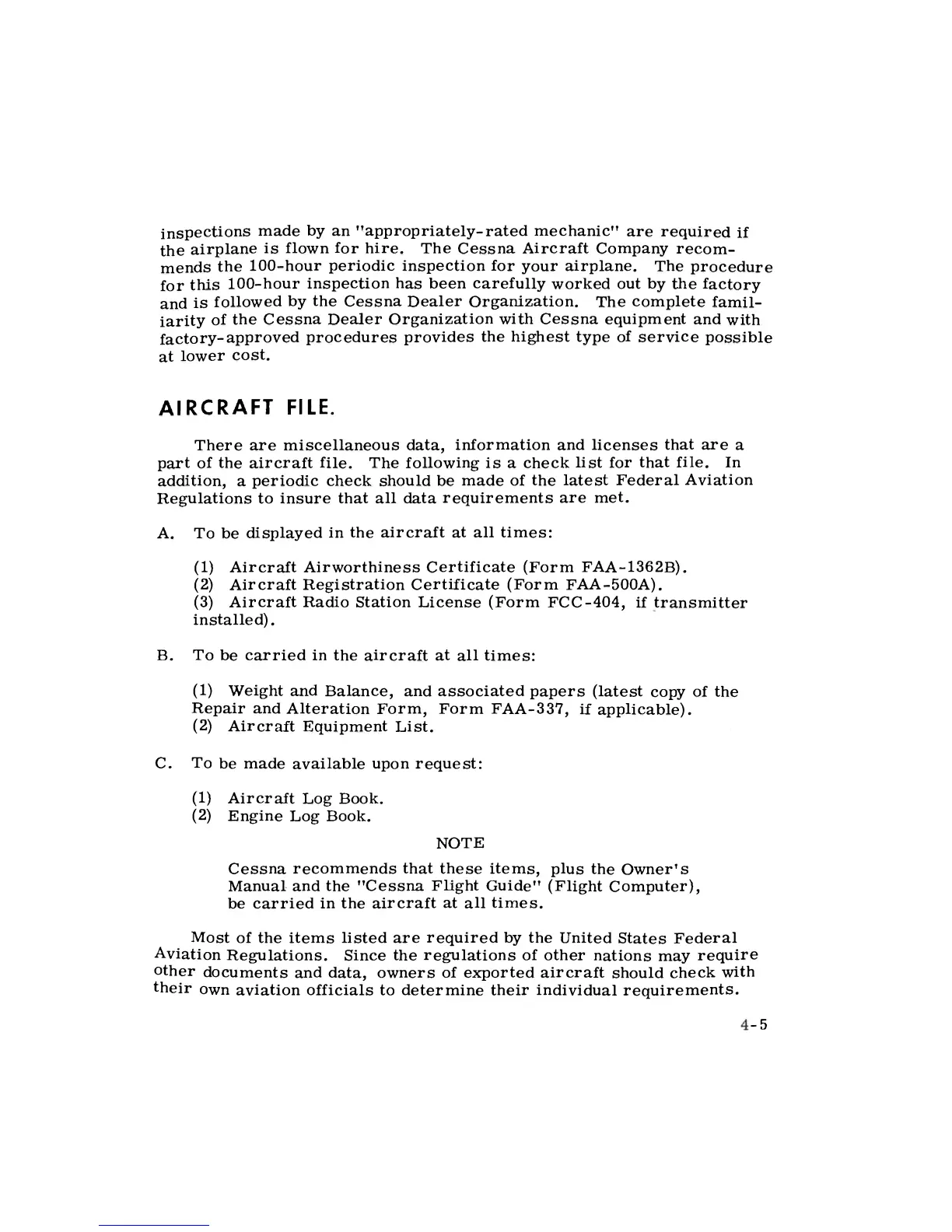 the airplane is flown for hire. The Cessna Aircraft Company recom-