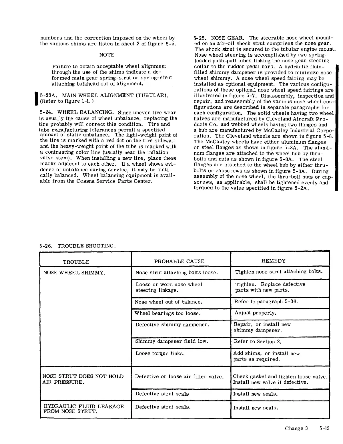 Cessna 150J - Main Wheel Alignment; Wheel Balancing; Trouble Shooting; Nose Gear