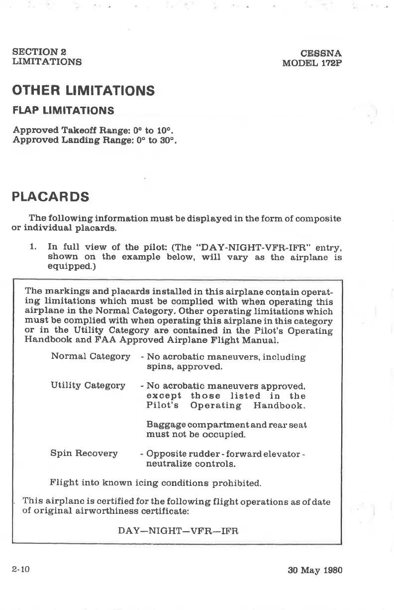 Cessna 172P - Normal Category; Utílity Category; Utility Category; Other Linitations