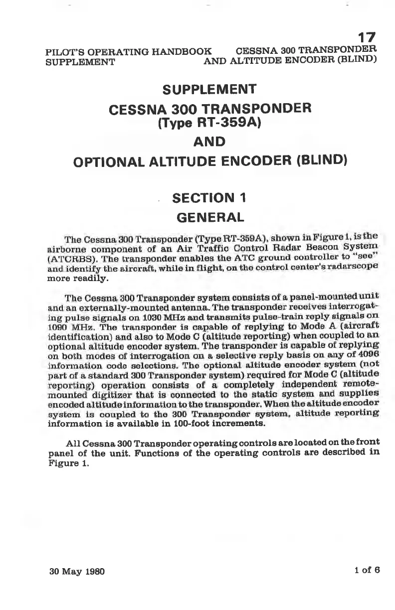 Cessna 172P - CESSNA 300 TRANSPONDER AND OPTIONAL ALTITUDE ENCODER (BLIND) (Type RT-359 A; EA-401 A)